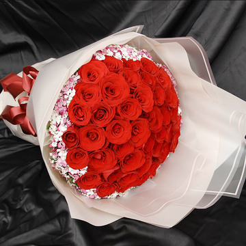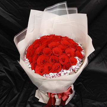 粉色雾面纸加透明白边雾面纸扇形包装,红色丝带系蝴蝶结。花语:开始的地方,动心的凝望,谢谢你陪我,在不忘初心的路上!附送: