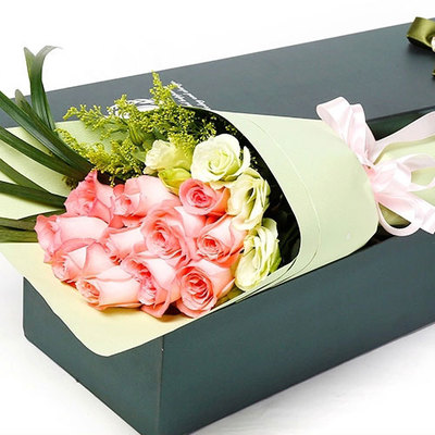 浅绿色硬纸包装,手握处系粉色丝带,白色礼盒花语:时间将证明我对你坚定而又执着的爱,别让时空距离猜疑彼此的真情与信心,坚持到底决不轻言放弃附送: