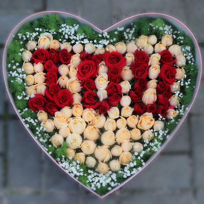 99朵红玫瑰和香槟玫瑰混搭,香槟玫瑰拼字i❤u,蓬莱松,满天星围绕