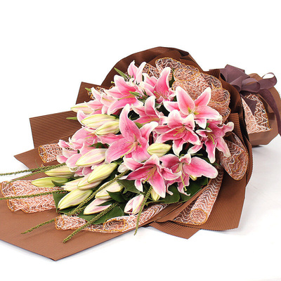 21朵香水百合,外围满天星、黄莺点缀。