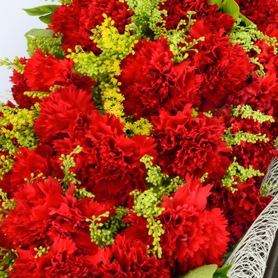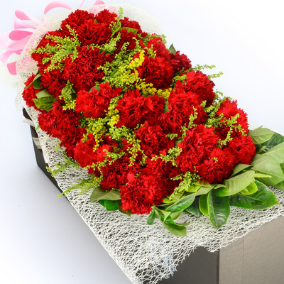 19枝红色康乃馨,黄莺间插丰满,绿叶外围