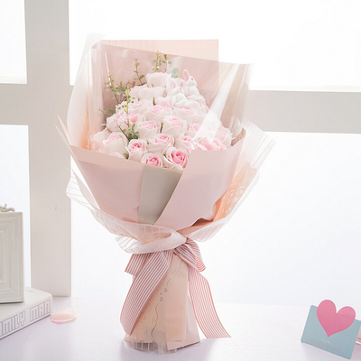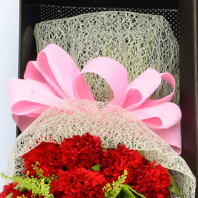 白色提花大雁网扇形包装,粉色丝带扎束,长方形礼盒装花语:我送你一棵忘忧草,为你逮只幸福鸟,当幸福鸟含着忘忧草向你飞来时,请把你的心整理好,那是我对你最好的祈祷:希望你快乐到老!附送: