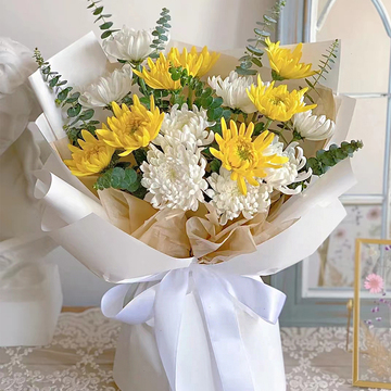 复古英文报纸扇形包装,米黄色缎带束扎。花语:清浅流年,情暖一季,怀念的孤烟,像呼吸一样自然。附送: