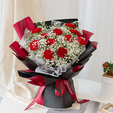 红+黑双面欧雅纸层次包装,红色缎带束扎花语:愿你抱着平安,拥着健康,揣着幸福,携着快乐,搂着温馨,带着甜蜜,我的祝福第一站,就在快乐小站附送: