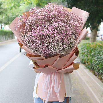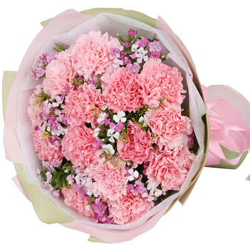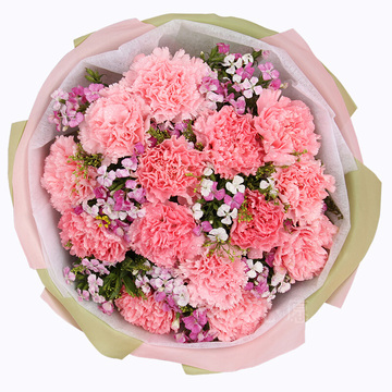 19朵粉色康乃馨,粉色石竹梅丰满间插,黄莺点缀
