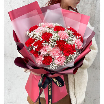 19朵红粉色混搭康乃馨花束,白色满天星丰满间插