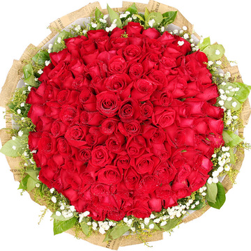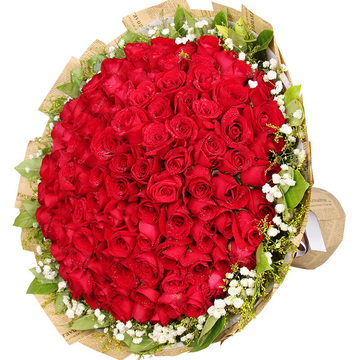 99支红色玫瑰,白色满天星丰满围边,黄莺和栀子叶绕边间插