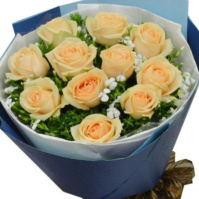 精选11朵香槟玫瑰,绿材点缀满天星。