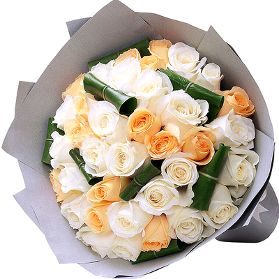 14朵白玫瑰,19朵香槟玫瑰,巴西叶装点