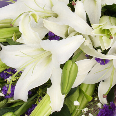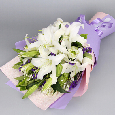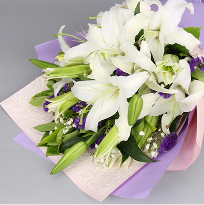 5枝多头白百合,满天星、黄莺、勿忘我搭配。