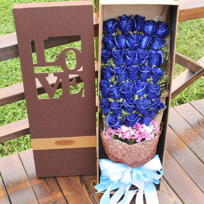精选33朵蓝色妖姬,搭配绿叶,石竹梅。