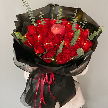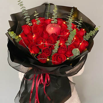 33朵红玫瑰,1个苹果,发光灯带一条,尤加利间插