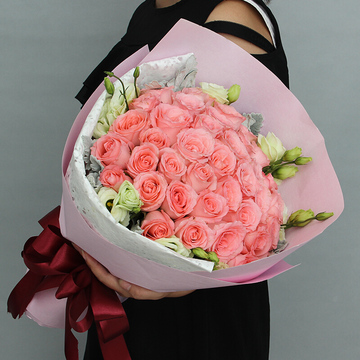 33朵戴安娜粉玫瑰,白色洋桔梗、银叶菊搭配。