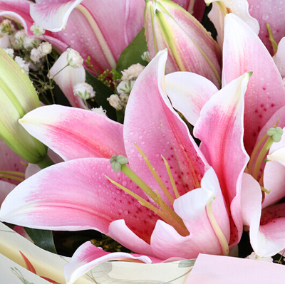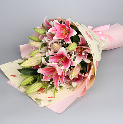 21朵粉百合,满天星、黄莺、栀子叶搭配。