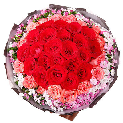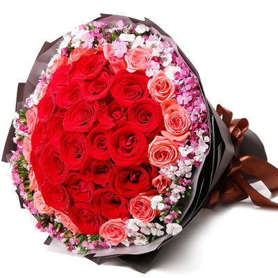 23朵红玫瑰,10朵戴安娜粉玫瑰,外围石竹梅丰满点缀