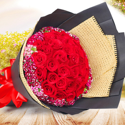 麦色网格纸内村,深褐色包装纸外包,丝带系蝴蝶结。花语:初见你,就知道这一生只为你倾倒。附送: