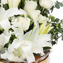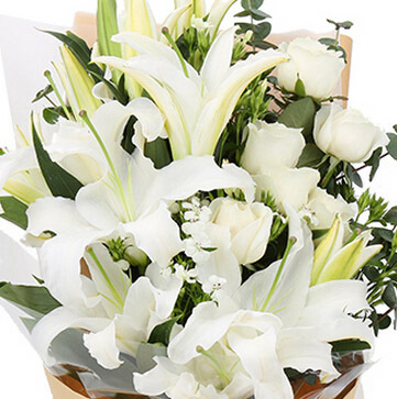 6支白百合,6支白玫瑰,尤加利叶、相思梅搭配。