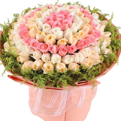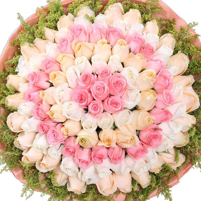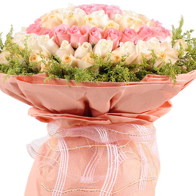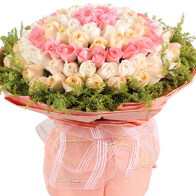 99枝粉玫瑰、香槟玫瑰、白玫瑰混色包装,黄莺外围