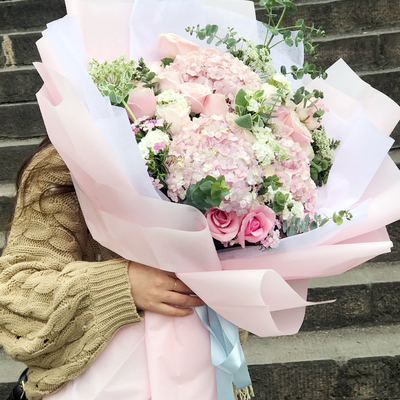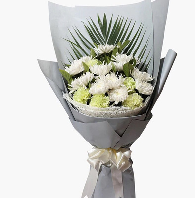 白色+灰色雾面纸层次包装,黑色英文缎带束扎花语:是你赋予了如此神圣的爱,带我逃离荒芜地带,为你我愿意热爱整个世界,从此擦干泪眼……附送: