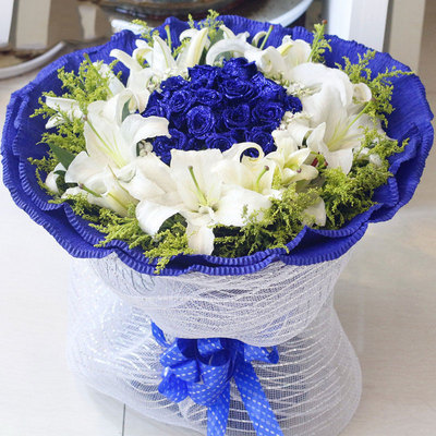 精选19枝蓝玫瑰,8朵白百合,黄莺间插