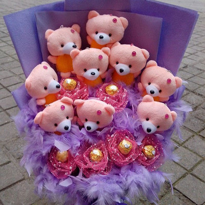 9只可爱小熊,6颗巧克力,紫色羽毛丰满。