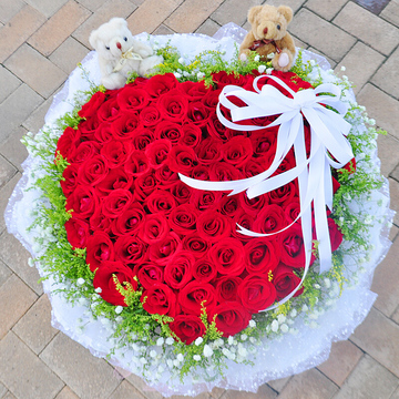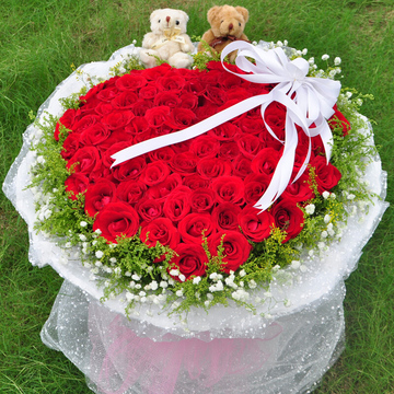 99枝红玫瑰,黄莺、满天星外围,随机赠送两只可爱小公仔,白色丝带扎法式蝴蝶结