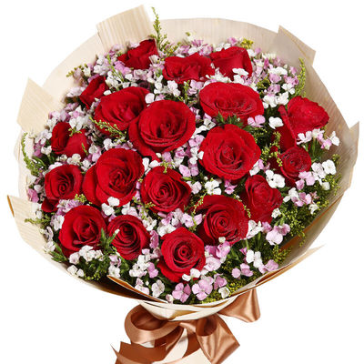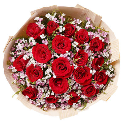 19朵红玫瑰,相思梅丰满间插,黄莺点缀