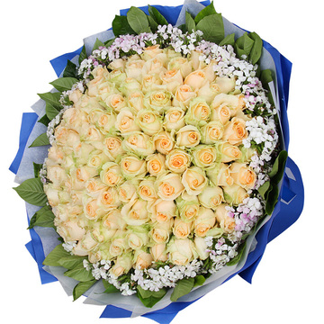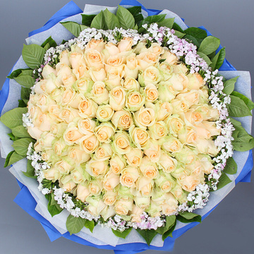 99朵香槟玫瑰,相思梅丰满围边,栀子叶绕边间插