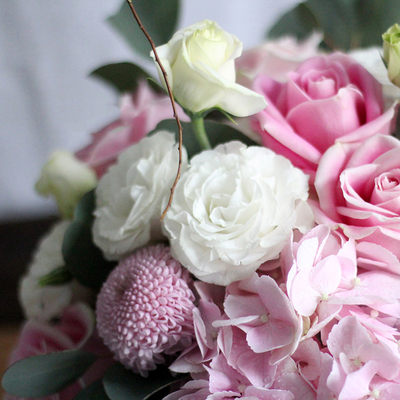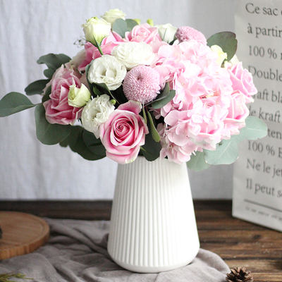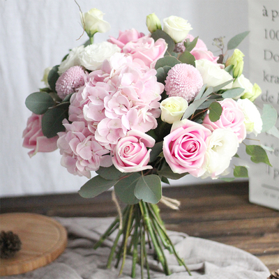 7朵粉玫瑰,10朵洋桔梗,1个粉色绣球、粉色乒乓菊、进口尤加利叶搭配。
