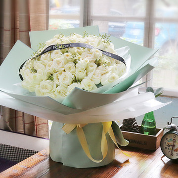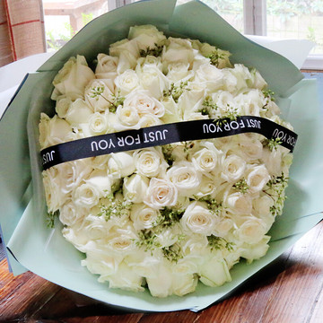 99枝白玫瑰,点缀绿色叶材,缎带。