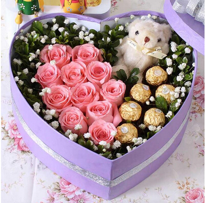11朵粉玫瑰,6颗巧克力,1只小熊,搭配绿叶或满天星