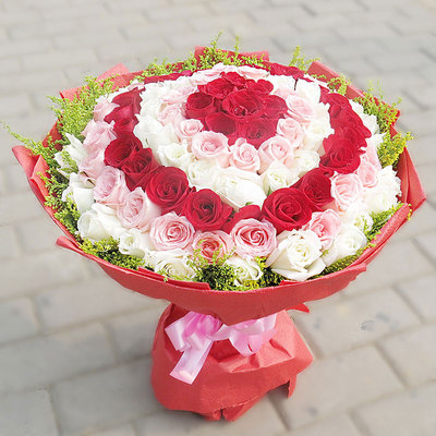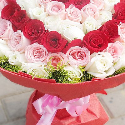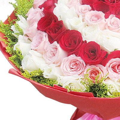 精选99朵优质红、戴安娜、白玫瑰花间插,加拿大黄莺外围点缀
