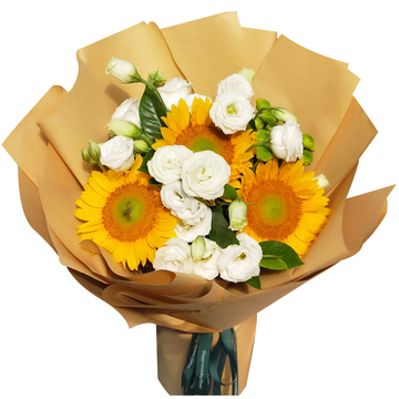 3枝向日葵,5枝白桔梗,适量绿色小菊,栀子叶间插