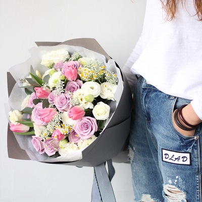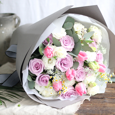 11朵紫玫瑰,6朵郁金香(季节性花材,没有换成戴安娜玫瑰),5支洋桔梗、洋甘菊、蕾丝、尤加利叶搭配。