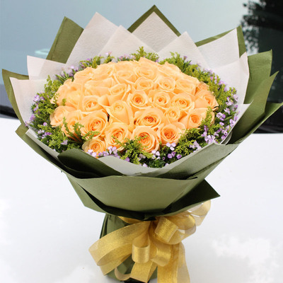33朵多香槟玫瑰,加拿大大黄莺和小配花外围(没有可用其它代替)