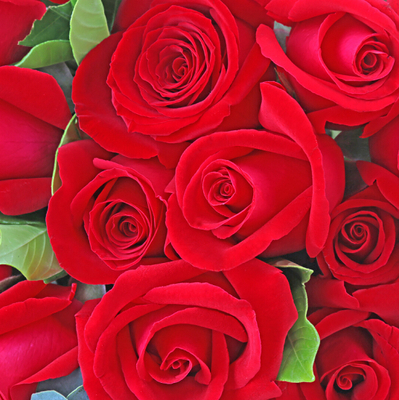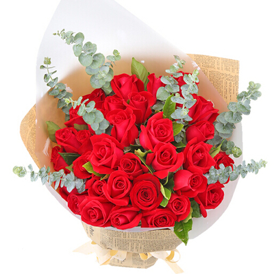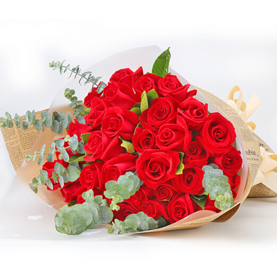 33支红玫瑰,尤加利叶、栀子叶搭配。