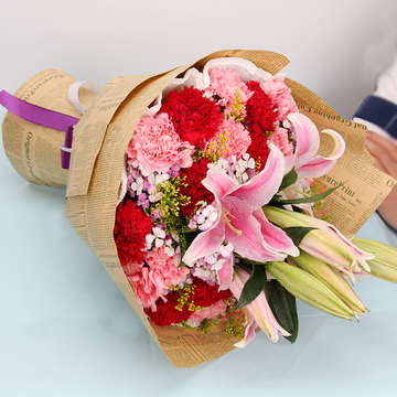 19朵康乃馨(红色+粉色混搭),2枝多头粉百合,粉色石竹梅间插,黄莺点缀