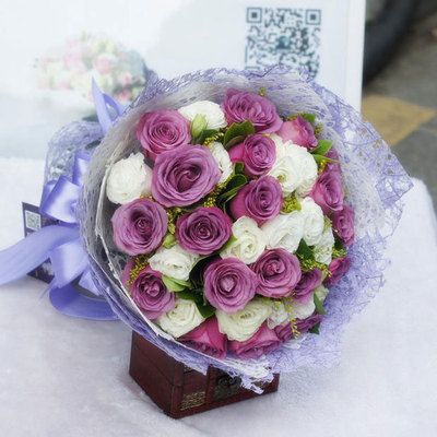 11枝紫玫瑰,10枝白玫瑰,桔梗、绿叶、黄莺点缀间插。