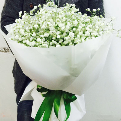 白色雾面纸圆形包装,绿色丝带扎束花语:每一个女孩都曾经是天使,为了寻找爱情才落入人间。永远,不要让爱上你的女孩因为悲伤而流泪,因为她为了你放弃了整个天堂。附送: