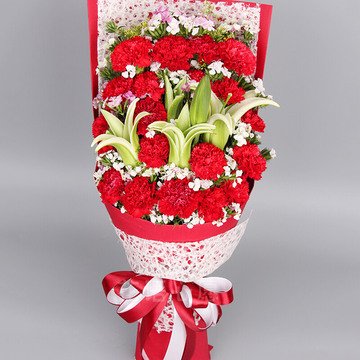 19枝红色康乃馨,2枝多头白色香水百合。黄莺,满天星搭配。