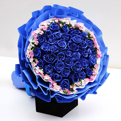 精选33朵蓝色妖姬,外围搭配石竹梅填充。