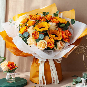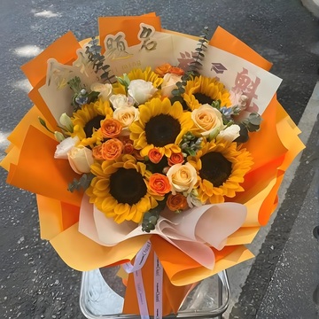 11支粉色康乃馨,2支向日葵,3支香槟玫瑰,3支粉色多丁康乃馨,白桔梗搭配,尤加利间插