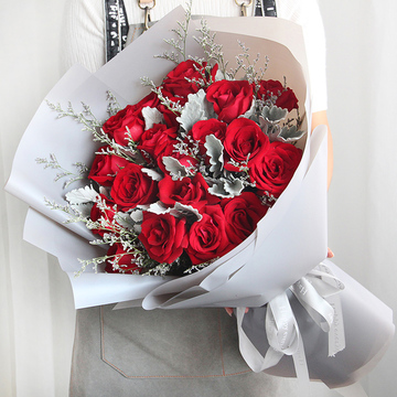 19朵红色康乃馨,满天星、尤加利、黄英搭配