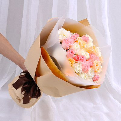 11朵白玫瑰,11朵安娜粉玫瑰,11朵香槟玫瑰混搭。