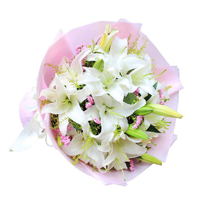 5枝多头白香水百合,黄莺间插,粉色相思梅点缀。
