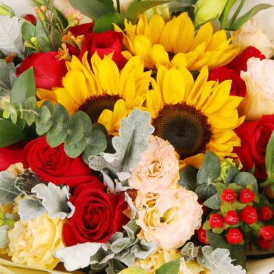 11支精品红玫瑰+3支向日葵,搭配5支香槟色洋桔梗、红豆、尤加利、银叶菊