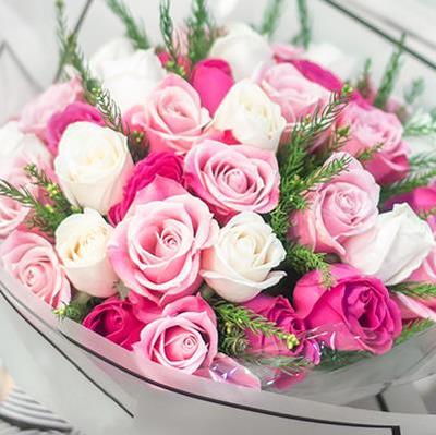 33朵戴安娜、白玫瑰、大桃红玫瑰混搭,马尾松针间插