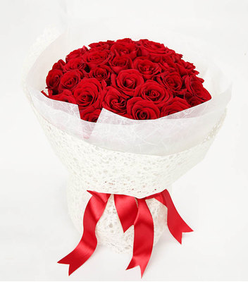 内衬双层白色印花绵纸,外围白色落水纸圆形包装,红色缎带蝴蝶结扎束花语:美轮美奂的婚礼只为与佳人相约三生三世附送: