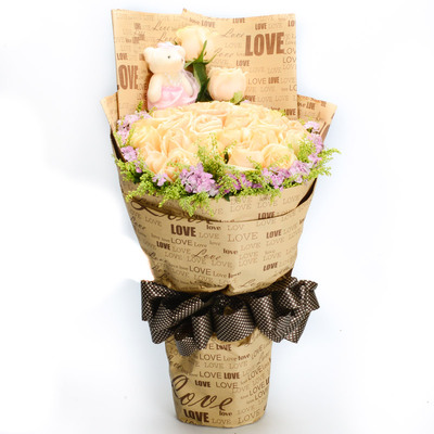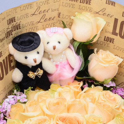 33枝香槟玫瑰,相思梅、加拿大黄莺外围点缀,随机赠送两只可爱小公仔