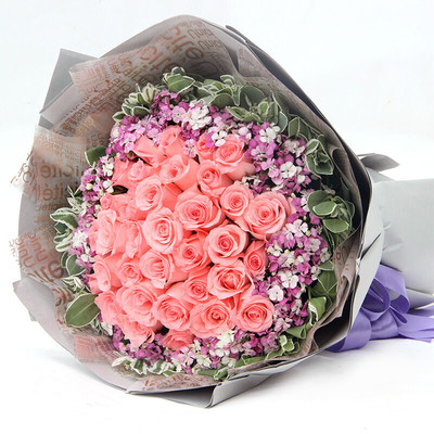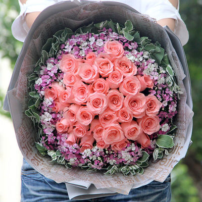33朵戴安娜粉玫瑰,相思梅丰满围边,高山积雪(或绿叶)外层点缀